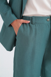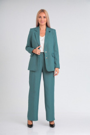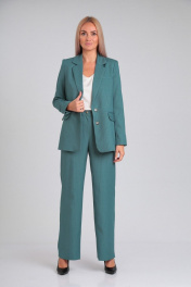 Костюм женский состоит из жакета и брюк. Жакет из костюмной ткани на подкладке, полуприлегающего силуэта, с лацканами, отложным воротником и центрально бортовой застежкой на петли и пуговицы. Перед с нагрудными вытачками, прорезными карманами с клапаном, имитацией нагрудного кармана. Спинка со средним и рельефными швами. Рукав втачной двухшовный с имитацией шлицы. Воротник отложной пиджачного типа. Длина по спинке 70. Длина рукава 62. Брюки из костюмной ткани свободного силуэта, с карманами в боковых швах, с гульфиком и застежкой «молнией», на поясе с резинкой и застежкой на петли-пуговицы. Длина 108. Фурнитура может отличаться.