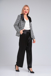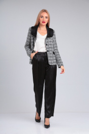 Костюм женский комбинированный состоит из жакета и брюк. Жакет из костюмной ткани на подкладке, полуприлегающего силуэта, с отложным воротником и центрально бортовой застежкой на петли и пуговицы. Перед с талиевыми вытачками, прорезными карманами с листочкой. Спинка со средним и рельефными швами. Рукав втачной двухшовный с имитацией шлицы. Воротник отложной, круглый из отделочной ткани. Длина по спинке 60. Длина рукава 62. Брюки из сатина свободного силуэта, с карманами в боковых швах, с гульфиком и застежкой «молнией», на поясе с застежкой на петли-пуговицы. Длина 106.