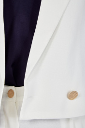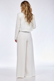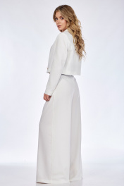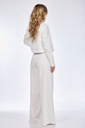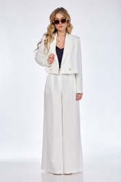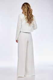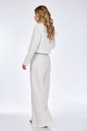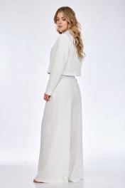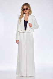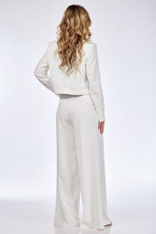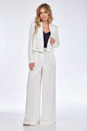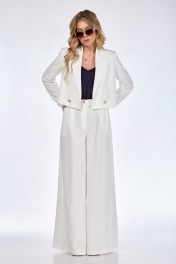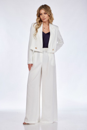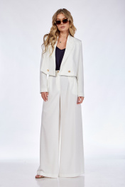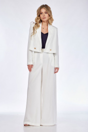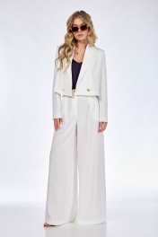 Жакет укороченный из костюмной ткани на подкладке, свободного силуэта, двубортный, с лацканами и воротником пиджачного типа, с застежкой на петли и пуговицы. Рукав втачной двухшовный. Длина по спинке 45. Длина рукава 62. Брюки из костюмной ткани свободного силуэта, с карманами в боковых швах, с гульфиком и застежкой «молнией», на поясе с застежкой на петли-пуговицы. Длина 113