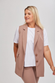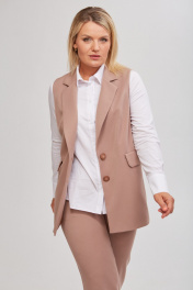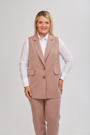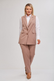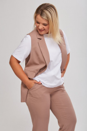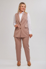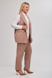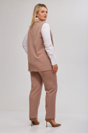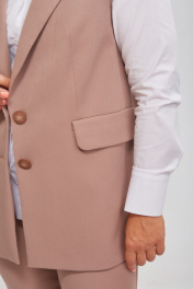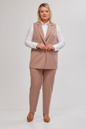 Костюм состоит из жилета и брюк. Жилет из костюмной ткани на подкладке, полуприлегающего силуэта, отложным воротником и центрально бортовой застежкой на петли и пуговицы. Перед с талиевыми вытачками, прорезными карманами с листочкой. Спинка со средним швом и отрезными бочками. Воротник отложной на стойке, пиджачного типа. Длина по спинке 75 Брюки из костюмной ткани, зауженные к низу, с карманами в боковых швах, на поясе на резинке.Длина по боковому шву 106