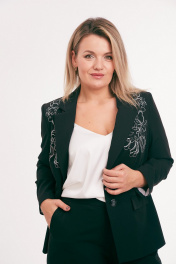 Костюм состоит из жакета и брюк. Жакет из костюмной ткани на подкладке, полуприлегающего силуэта, с отложным воротником и лацканами, с центральной бортовой застежкой на петли и пуговицы. Перед с талиевыми вытачками, прорезными карманами с клапаном и вышивкой в области груди. Спинка со средним и рельефными швами. Рукав втачной двухшовный. Воротник отложной пиджачного типа. Длина по спинке 66. Длина рукава 63. Брюки зауженные к низу, с карманами в боковых швах, гульфиком с застежкой-«молнией», на поясе с резинкой по спинке, и застежкой на петли и пуговицы. Длина 104