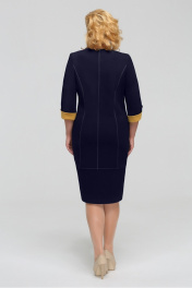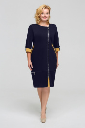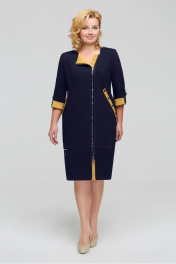 Трикотажное женское платье с рукавом 3/4 и заметной асимметричной двусторонней застёжкой-молнией. По переду в фигурные швы вставлены отделочные детали из контрастной ткани с пришитыми на них пуговицами. Рукава с отворотами из контрастной ткани, закреплённые патой с пряжкой. Длина платья ок. 107 см. Длина рукава ок. 44 см.