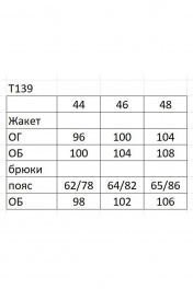 жакет ПЭ 64% , вискоза 33%, спандекс 3%, брюки ПЭ 70%, вискоза 27%, спандекс 3%