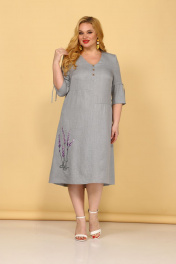 Лёгкое платье прямого силуэта, длиной ниже колена, слегка расширенное к низу. Перед с нагрудными вытачками, имитацией застёжки на 3 пуговицы, средним швом и ассиметричными горизонтальными подрезами. Спинка со средним швом и горизонтальными подрезами на разных уровнях. Нижние части переда и спинки слегка присобраны. Горловина V-образной формы. Рукава одношовные втачные, длиной ниже уровня локтя. На рукавах обработаны планки-кулисы и втянуты шнурки. Низ изделия разноуровневый, спинка длиннее по отношению к переду на 5 см. Ярким акцентом служит вышивка-декор лаванда на нижней части переда платья. Длина платья - 114 см, длина рукава - 41,5 см.