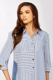 Стильное платье прямого силуэта, комбинированное из двух видов ткани. Продуманные линии кроя выгодно обрамляют фигуру, а сочетание однотона и полоски добавляет образу графичности и стиля. Перед платья асимметричный с наклонным подрезом, нагрудными вытачками, шлицей в среднем шве, рельефами и двумя парами карманов (накладные и внутренние в шве рельефа). Застёжка центральная бортовая на 4 петли и пуговицы. Горловина обработана рубашечным воротником. Спинка с подрезом и выходящими из него складкой и декоративной шлёвкой. В боковых швах обработаны разрезы. Рукав втачной с отрезной манжетой на пуговице, длиной 3/4. Отделкой изделия служит фурнитура (может отличаться от представленной на фото). Длина платья от центра горловины спинки до низа: 108 см. Длина рукава: 40.5 см.