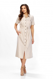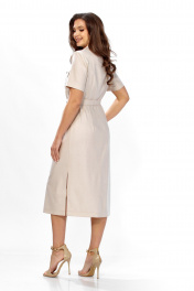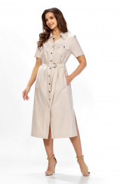 Элегантное платье в стиле сафари — безупречный выбор для тех, кто ценит комфорт и стиль в летнюю жару. Платье прямого силуэта со съёмным поясом. На переде обработаны кокетки, нагрудные вытачки, два кармана с клапанами, карманы с листочками, застёжка-планка на 9 петель и пуговиц. Спинка с кокеткой, средним швом и талиевыми вытачками. В боковых швах обработаны разрезы. Рукав втачной, короткий. Воротник стояче-отложной со стойкой. Отделкой изделия служит фурнитура(может отличаться от представленной на фото). Длина платья от центра горловины спинки до низа: 115 см. Длина рукава: 25 см.