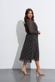 Платье из шифона с отрезным лифом и разведённым низом. Лиф переда выполнен запашным из присборенных у плеча и в талии деталей. Нижние детали платья также с запахом. Платье можно подвязывать поясом. Рукава в ¾ длины, сверху присборены и снизу собраны на эластичную тесьму. Изделие на лёгкой подкладке. Длина по спинке ок. 124 см. в 52м.