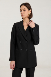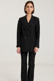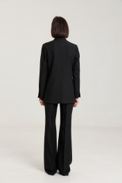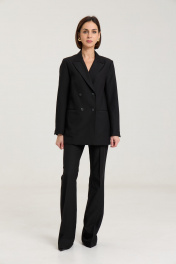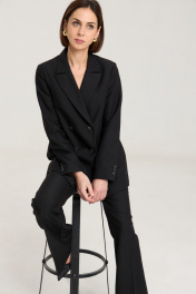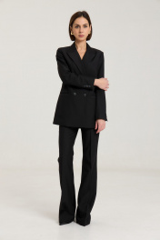 Комплект двухпредметный из жакета и брюкЖакет двубортный, с нагрудными выточками, прорезные карманы в рамку с клапанами, застежка на петли и пуговицы, спинка со средним швом, втачные двухшовные рукава, с тремя отделочными пуговицами,жакет на подкладке. Выполнен из премиальной ткани костюмной группы.Классические расклешенные брюки полупрелегающегоьсилуэта с высокрй посадкой, пояс притачной со шлевками, застежка на молнию и петлю-пуговицу, брюки без карманов. Выполнены из премиальной ткани костюмной группы. Жакет. Длина изделия по спинке 71 см, длина рукава 60 см. Брюки. Длина по боковому шву 111 см, полуобхват талии 35 см, полуобхват бедер 45 см , высота посадки 30 см в 42-м размере.
