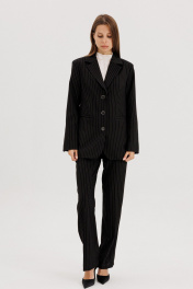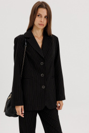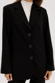 Жакет прямого силуэта, однобортный, выполнен из костюмной ткани черного цвета в полоску бежевого цвета, с застежкой на три петли-пуговицы, рукав втачной двухшовный, со шлицей, пуговицы на шлице функциональные. Перед пиджака обработан выточками, по бокам прорезные функциональные карманы с листочкой. Спинка со средним швом, сзади шлица. Жакет на подкладке, подкладка контрастная - бежевого цвета в тон полоске. Длина изделия 70 см по спинке, длина рукава 61см.