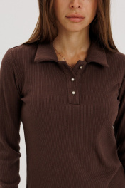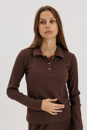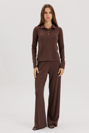 Джемпер-поло выполнен из трикотажной ткани коричневого цвета. Ткань держит форму, не просвечивает. Воротник отложной, застежка на три петли-пуговицы. Рукав втачной. Длина по спинке 60 см, рукав 63 см. Ткань тактиль-приятная к телу, мягкая. Джемпер можно носить самостоятельно, а также с брюками из основной ткани их нашей коллекции. Рост модели на фото 178 см.