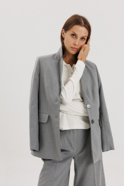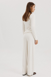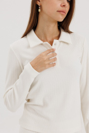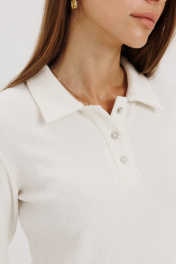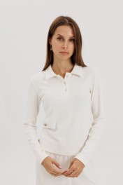 Джемпер-поло выполнен из трикотажной ткани молочного цвета. Ткань держит форму, не просвечивает. Воротник отложной, застежка на три петли-пуговицы. Рукав втачной. Длина по спинке 60 см, рукав 63 см. Ткань тактиль-приятная к телу, мягкая. Джемпер можно носить самостоятельно, а также с брюками из основной ткани их нашей коллекции. Рост модели на фото 178 см.