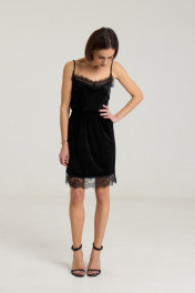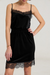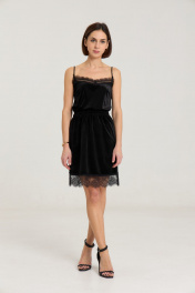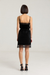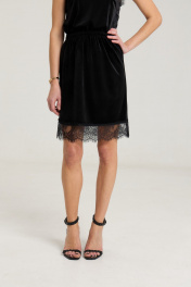 Юбка в длине миди выполнена из мягкой велюровой ткани черного цвета. Юбка на резинке, прямого силуэта, по низу отстрочено французким широким кружевом. Пот - 30 см, поб - 45см, длина по боковому шву с поясом 54 см - вместе с кружевом, ширина кружева 9 см. Юбку можно сочетать вместе с топом из нащей коллекции, либо самостоятельно. Юбка без подлкадки.