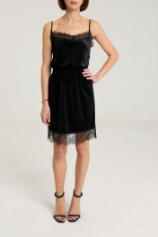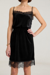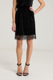 Комплект двухпредметный из топа и юбки, выполнен из мягкой велюровой ткани. Топ полуприлегающего силуэта, по переду и спинке отстрочено кружевом. Длина -40см с кружевом, полуобхват груди 40 см в 42-м размере.Юбка в длине миди выполнена из мягкой велюровой ткани черного цвета. Юбка на резинке, прямого силуэта, по низу отстрочено французким широким кружевом. Пот - 30 см, поб - 45см, длина по боковому шву с поясом 54 см - вместе с кружевом, ширина кружева 9 см. Юбка без подлкадки.