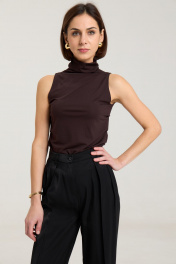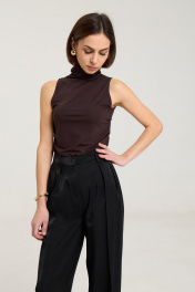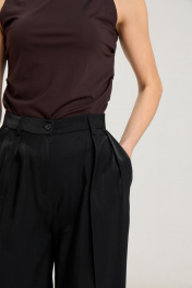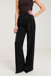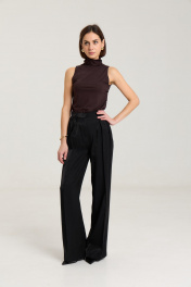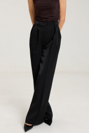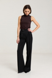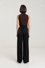 Брюки на притачном поясе со шлевками, спереди застежка на молнию и петлю-пуговицу, по переду защипы, посадка высокая. По передним половинкам брюк функциональные карманы и две двусторонние складки, выполнены из премиальной ткани с блеском, ткань легкая. по переду и сзади отсточены стрелки. Длина по боковому шву 110 см, полуобхват талии 33 см , полуохват бедер 46 см в 42-м размере.