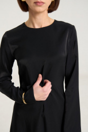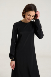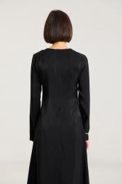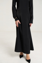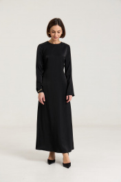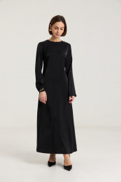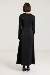 Платье в длине макси в черном цвете, полуприлегающего силуэта,расклешенное к низу, застежка в среднем шве на потайную молнию. Рукав втачной, прямой, по спинке талиевые выточки, по переду нагрудные выточки. Выполнено из лекой ткани с блеском, очень красиво передивается и придает образу изысканность и лоск. Платье без подкладки. Длина по спинке 128 см, длина рукава - 62 см, полуобхват груди -44 см, полуобхват спинки в 42-м размере.