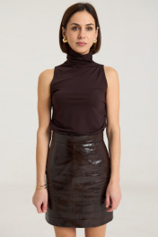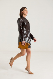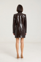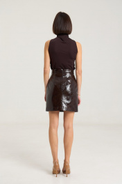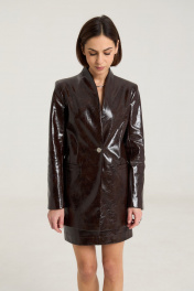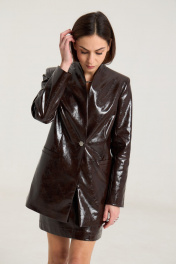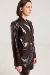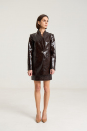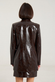 Комплект двухпредметный, состоит из жакета и юбки. Жакет однобортный на однй центральную петлю-пуговицу, на подкладке, полуприлегающего силуэтас прорезными карманами в рамку по переду. Воротник втачной-стойка, рукав двухшовный, спинка жакета разрезная по центру с талиевыми выточками. Жакет выполнен их плотной лаковой экокожи премиум качества шоколадного цвета Длина по спинке 74 см, рукав -61 см, полуобхват груди - 45 см, плечо - 41 см. рост модели на фото 168 см. Юбка прилегающего силуэта на притачном поясе, посадка высокая , юбка на подкладке, изделие имеет центральный шов спереди и сзади. В среднем шве застежка на потайную молнию. Юбка выполнена из плотной лаковой экокожи шоколадного цвета. Длина изделия 45 cм с поясом , полуобхват талии в 42-м размере 34 см, полуобхват бедер - 45 см .Рост модели на фото 168 см.