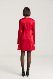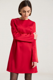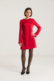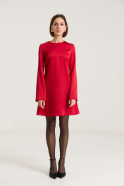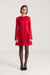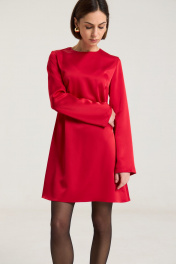 Платье полуприлегающего силуэта, расклешнное к низу, рукав свободный, втачной. По груди нагрудные выточки, по спинке талиевые выточки, застежка на потайную молнию в среднем шве. Платье выполнено из плотной атласной ткани красного цвета.Платье без подкладки. Длина по спинке 85 см, полуобхват груди - 44 см, длина рукава - 63 см, длина плеча - 11 см в 42-м размере. Рост модели на фото 168 см.