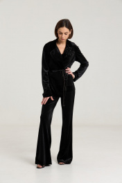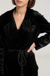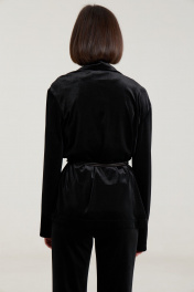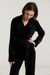 Легкий жакет из бархата дополнит ваш не только праздничный образ , но и повседневный .Жакет прямого кроя на запах под декоративный пояс- шнур,без пуговиц, без покладки , спинка без среднего шва. Отделочные строчки по борту воротника и поясу на 0,7 мм. Длина по спинке 74 см, длина рукава 61 см.