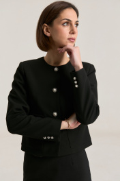 Комплект двухпредметный, состоящий из жакета и юбки. Жакет из мягкой костюмной ткани укороченный, прямого силуэта, с втачными рукавами , горловина округлой формы, без воротника. Детали переда - нагрудными выточки, с настрочными листочками выше линии груди и на уровне талии. По бокам накладные функциональные карманы с застежкой на петлю-пуговицу. Застёжка жакета центральная однабортная на петли и пуговицы. спинка со средним швом и рельефами без шлиц и пуговиц. Жакет на подкладке. Юбка прилегающего силуэта на притачном поясе, посадка высокая , юбка на подкладке.В среднем шве застежка на потайную молнию, Жакет. Длина по спинке 50 см,Длина рукава 59 см . Юбка. Длина изделия 46 cм, полуобхват талии в 42-м размере 34 см.