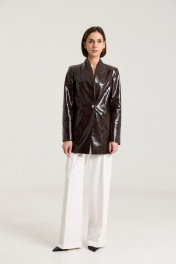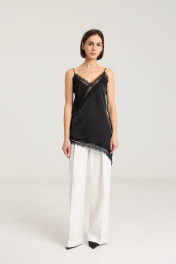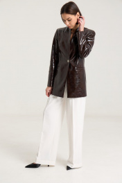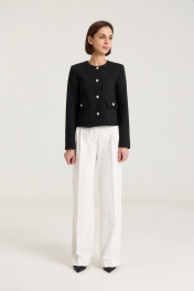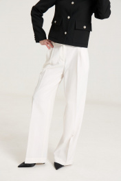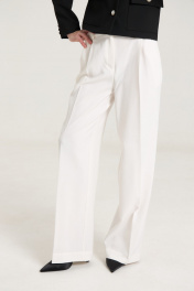 Брюки прямые классические с боковыми карманами, спереди застежка- молния, по переду защипы. Брюки выполнены из премиальной ткани костюмной группы.Верх брюк обработан притачным поясом со шлевками. Выполнены из плотной костюмной ткани молочного цвета.Брюки не просвечивают. Длина брюк по боковому шву - 107см, посадка высокая, ширина внизу брючины - 28см, полуобхват талии в 42-м размере - 32см.