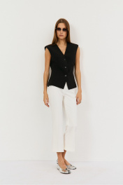 Жилетка выполнена из костюмной ткани, приталенного силуэта. По переду две талиевые выточки, вырез V-образный, спинка разрезная по центру сдвумя талиевыми выточками. Жилетка на подкладке с плечевыми накладками. Застежка по переду на функциональные три петли-пуговицы. Полуобхват груди - 46 см, длина по спинке - 58 см, спереди - 60 см в 42-м размере.