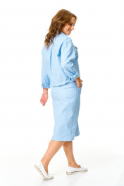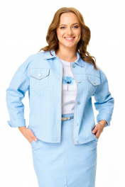 Летний комплект в небесном цветовом сочетании состоит из жакета и юбки из денима и белой трикотажной футболки с термопечатью по переду. Стильный облегченный укороченный жакет-рубашка из хлопковой комбинированной по цвету ткани свободного силуэта. С воротником, застежка на петли-пуговицы. По переду накладные карманы. По спинке складка от кокетки. Низ свободный, спинка стягивается. Рукав длинный с манжетой. Длина по спинке размер 46-50 54 см Длина по спинке размер 52-54 58 см Длина рукава 51 см и длина плеча 22 см Юбка из плотного денима полуприлегающего силуэта. Застежка по спинке на «потайную» молнию. Пояс притачной с резинкой по бочкам. Глубокие наклонные карманы . По среднему шву переда шлица с застегивающимися пуговицами. Юбка без подкладки. В шлевки продет ремень. Длина юбки: 72 см Окружность по талии : размер 46-68-78 см размер 48-72-82 см размер 50-76-86 см размер 52-80-90 см размер 54-84-94 см Объем по бедрам: размер 46-102 см размер 48-106 см размер 50-110 см размер 52-114 см размер 54-116 см Полуоблегающая футболка из трикотажного полотна с круглой горловиной и коротким рукавом. Длина 56 см размер 50-54 Длина 52 см размер 46-48 Длина рукава 20 см