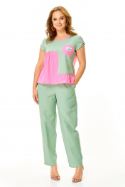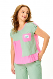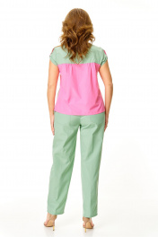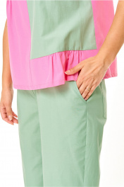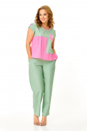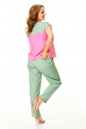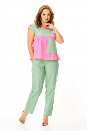 Легкий летний комплект состоит из блузки и брюк в сочетании цветов яркой розы и нежной мяты. Недлинная романтичная блузка свободного силуэта. Горловина круглая. По переду накладной карман. По спинке кокетка. Низ свободный. Рукав короткий. Длина по спинке размер 46-50 57 см Длина по спинке размер 52-54 62 см Длина рукава размер 46-50 8 см Длина рукава размер 42-54 10 см Удобные брюки с высокой посадкой на талии, с глубокими карманами, по поясу резинка. По задним половинкам накладные карманы. Длина брюк 100 см. Окружность по талии размер 44-64 см- 96 см 46-70 см- 100см 48-74 см-104 см 50-78 см-108 см 52-84 см-112 см 54-88 см-116 см
