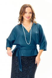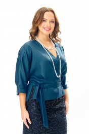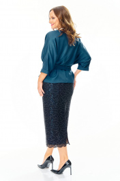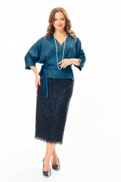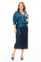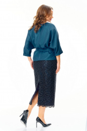 Эффектный нарядный комплект в вечернем цветовом сочетании синей ночи с черным, блеск и кружево. Блуза свободного силуэта. Горловина «на глубокий запах». Рукав цельнокроеный с манжетой. По низу переда планка, через которую протянут пояс. Спинка прямая. Длина блузки по спинке размер 46-50 56 см Длина блузки по спинке размер 52-54 61 см Длина рукава от горловины 52 см Обхват по груди размер 46-104 см 48-108 см 50-110 см 52-114 см 54-116 см Юбка из плотного черного кружева на цветной саржевой подкладке зауженная к низу с разрезом по спинке. Застежка «потайная молния» по среднему шву спинки. Верх на обтачке. Длина юбки- 72 см Объем по поясу размер 46-80 см 48-84 см 50-88 см 52-92 см 54-96 см Объем по бедрам размер 46-103 см 48-107 см 50-111 см 52-115 см 54-119 см