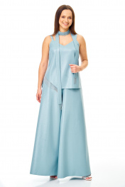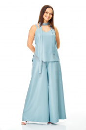 Комплект: топ со съемным поясом и брюки. Нарядный современный комплект. Не сковывает движения, стройнит. Брючный комплект из плотной плательной ткани с легким блеском. Удлиненный топ на регулируемых бретелях с ассиметричным разрезом, с отделкой из металлизированной тесьмы «цепочки». Не притален. Съемный пояс для стилизации образа. Длина по спинке 51 см Длина по боковому шву 42 см Обхват по груди размер 44-88 см 46-92 см 48-96 см 50-100 см 52-104 см 54-108 см Струящиеся брюки с высокой посадкой на талии широкие к низу, молния сзади, по поясу резинка. Длина брюк 102 см. Ширина брюк по низу 47-50 см в сгибе Окружность по талии (резинка не растянута) размер 44-64-74 см 46-68-78 см 48-74-84 см 50-78-88 см 52-84-94 см 54-88-98 см