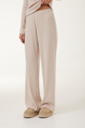 Комплект женский двух предметный, выполнен из мягкого трикотажного полотна бежевого цвета. Комплект состоит из джемпера и брюк. Джемпер полуприлегающего силуэта. Горловина округлая. Рукава втачные одношовные, длинные. Брюки прямого силуэта, пояс на резинке, без карманов. Длина джемпера по спинке 62 см, длина рукава 64 см. Длина брюк по боковому шву с поясом 107 см. Длина брюк по внутреннему шву 80 см.