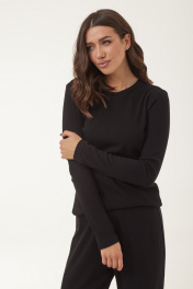 Комплект женский двух предметный, выполнен из мягкого трикотажного полотна черного цвета. Комплект состоит из джемпера и брюк. Джемпер полуприлегающего силуэта. Горловина округлая. Рукава втачные одношовные, длинные. Брюки прямого силуэта, пояс на резинке, без карманов. Длина джемпера по спинке 62 см, длина рукава 64 см. Длина брюк по боковому шву с поясом 107 см. Длина брюк по внутреннему шву 80 см.
