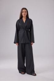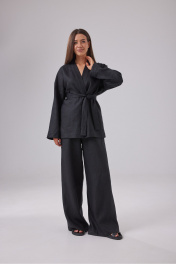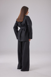 Комплект состоящий из блузы и брюк, выполнен из черного льняного полотна. Блузка свободного кроя, фиксируется на пояс. V-образный вырез, рукав прямой спущенный. Длина изделия по спинке 75 см, длина рукава от края горловины 75 см. Брюки свободного кроя на резинке. Длина изделия по боковому шву 115 см.
