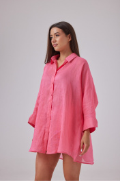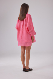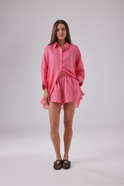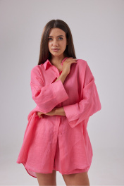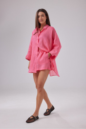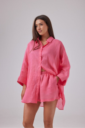 Рубашка свободного кроя выполнена из крапивы в ярком розовом цвете. Отложной воротник, центральная застежка на петли и пуговицы. Рукав длины 3/4 спущен, по низу рукава манжет. Длина по спинке 82 см, длина рукава от края горловины 64 см. Шорты свободного кроя на резинке с хлопковой подкладкой. Длина изделия по боковому шву 36 см.