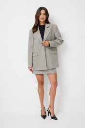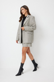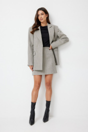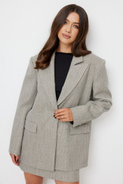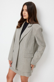 Жакет женский прямого силуэта, выполнен из костюмной ткани в елочку. Жакет свободного кроя, на подкладке. Застежка однобортная на одну петлю и пуговицу. Воротник пиджачный с лацканами. По полочкам прорезные карманы с клапанами. Рукава втачные длинные, одношовные, снизу рукава шлица с застежкой на пуговицы. Спинка прямая со средним швом, снизу шва шлица длиной 27 см. Длина изделия по спинке 75 см, длина рукава 63 см. Жакет составит стильный образ с юбкой М367.