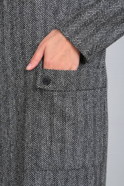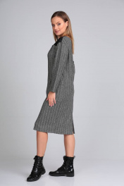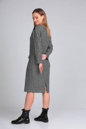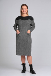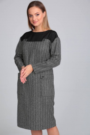 Платье прямого силуэта с кокеткой из отделочной ткани. Линия плеча спущена. Вырез горловины округлой формы. По переду нагрудные вытачки, переходящие в боковой шов в области линии бедра. По переду накладные карманы с отворотом. Застежка-молния по центру спинки 20 см. Длина изделия по спинке 102 см. Ширина изделия на уровне глубины проймы в 46р-52 см, в 48р-54 см, в 50р-56 см. Длина рукава 66 см. Ширина изделия по линии талии в 46р-50 см, в 48р-52 см, в 50р-54 см. Ширина изделия на уровне бедер в 46р-52 см, в 48р-54см, в 50р-56 см.