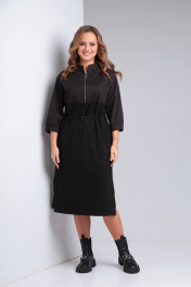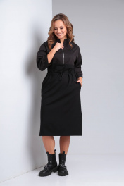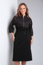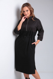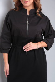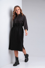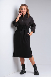 Платье женское комбинированное из двух тканей, свободного покроя, прямого силуэта. Отрезной лиф ниже уровня груди. По переду застежка на декоративную тесьму-молнию. По спинке средний шов. Линия плеча спущена. Горловина в виде цельнокроенной стойки. Рукав втачной присобран на широкую резинку по низу. Изделие приталивается кулисой. В боковых швах функциональные карманы и разрезы. Длина платья по спинке 112-116 см в зависимости от размера. Ширина изделия на уровне глубины проймы в 46р 52 см, в 48р 54 см, в 50р 56 см, в 52р 58 см, в 54р 60 см, в 56р 62 см. Длина рукава 40 см. Ширина изделия по линии талии в 46р 44 см, в 48р 46 см, в 50р 48 см, в 52р 50 см, в 54р 52 см, в 56р 54 см. Ширина изделия на уровне линии бедер в 46р 110 см, в 48р 112 см, в 50р 114 см, в 52р 116 см, в 54р 118 см, в 56р 120 см.