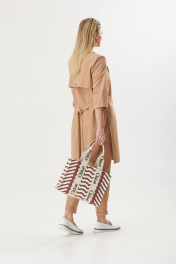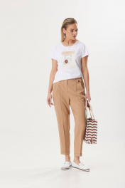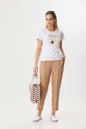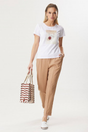 Элегантный женский костюм от белорусского производителя состоит из жакета, брюк и блузы. Жакет без подкладки прямого силуэта с намеком на полуприлегание, центральной бортовой застежкой на две петли-пуговицы. Рукав втачной, длиной ¾ с манжетой. Спинка с отлетной кокеткой и декоративной нашивкой, талиевыми вытачками и поясом, который можно завязывать спереди или сзади. В жакете по боковым швам расположены разрезы. Длина жакета – немного ниже колена. Брюки классической формы, зауженные к низу со стрелками по передним и задним половинкам. По низу брюк манжеты. Верхний срез брюк обработан поясом с резинкой по боковым швам. На задних половинках расположены талиевые вытачки, в боковых швах – наклонные карманы. Перед обработан поясом фигурной формы и декоративным клапаном, на котором пришита пуговица. Блуза выполнена из хлопкового трикотажного полотна прямого силуэта. Она дополнена нагрудными вытачками и коротким втачным рукавом. По переду майки расположен стильный принт, который подчеркнет уникальность образа. Одним из преимуществ костюма с удлиненным жакетом является его универсальность. Он подойдет как для делового стиля, так и для особых мероприятий или торжественных случаев. Сочетание такого костюма с брюками в едином цветовом решении, либо с контрастной деталью, создает гармоничный и стильный образ. Дополняя его аксессуарами, такими как пояс, шарф, брошь или сумка, можно добавить индивидуальности и неповторимости. Костюм с удлиненным жакетом – отличный выбор для тех, кто стремится выглядеть элегантно и модно. Благодаря своему уникальному дизайну он придает женщине уверенности и шарма. Независимо от того, какое мероприятие предстоит, такой костюм поможет создать неповторимый образ и вызвать восхищение окружающих.