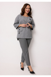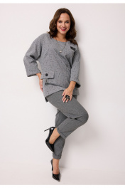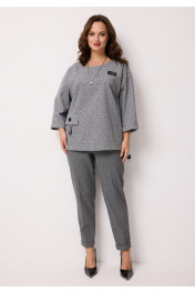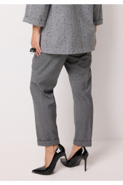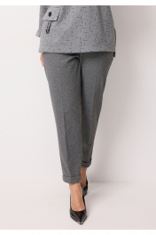Брюки прямого силуэта, слегка заужены к низу. Низ брюк с цельнокроеной манжетой. Брюки со стрелками по передним и задним половинкам. Верхний срез обработан притачным поясом, в который вставлена резинка. По центру переда - застёжка-обманка. На задних половинках расположены талиевые вытачки. В боковых швах расположены наклонные карманы.