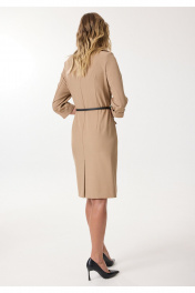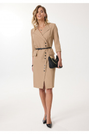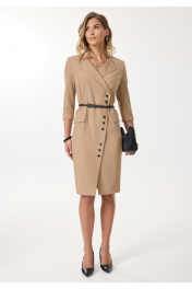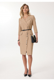 Элегантное платье полуприлегающего силуэта с асимметричной застежкой на петли и пуговицы. Перед платья с нагрудными вытачками и клапанами в области бёдер. Спинка с талиевыми вытачками и средним швом, внизу которого обработана шлица. Застежка асимметричная, двубортная, по низу платья расходится на разрез. В области плеч — погоны, закрепляющиеся на пуговицу. Рукава двухшовные втачные, длиной 3/4, с притачной манжетой. Платье с плечевыми накладками и со съёмным ремнем в цвет фурнитуры. Фурнитура и комплектующие (ремень) могут незначительно отличаться от представленных на фото. Платье отличается классической элегантностью в современной версии. Это именно то, что вы ищете, если вам важен имидж, стиль и классика. Данная модель — отличная идея стилизации для офисной работы, но не только… В зависимости от аксессуаров стильное платье подойдет и для многих других случаев.