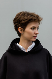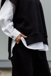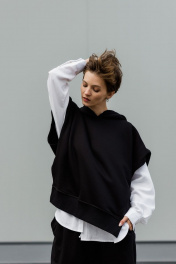 Суперстильная дизайнерская жилетка с капюшоном из премиального турецкого хлопка - изделие базового гардероба. Уникальная выкройка обеспечивает идеальную посадку обладательницам размеров от 42 до 52 (ростом от 160 до 180 см). Ширина Жилетки 65 см, высокие закругленные боковые разрезы позволяют сочетать ее как с рубашками и водолазками, так и футболками. Длина передней планки 65 см, спинки 72 см. Двухсторонний капюшон красиво выкладывается вокруг горловины и, надетый на голову, не тянет, а красиво обрамляет лицо. Глубокая пройма и спущенное плечо позволяют создать идеальный силуэт. Жилет с капюшоном отлично сочетается с брюками. джинсами, прямыми юбками, летом с шортами. Абсолютно универсальная вещь для любого гардероба и стиля. Уход за изделием: деликатная стирка с жидким моющим средством при температуре 30-40 градусов.