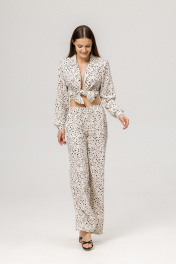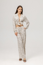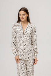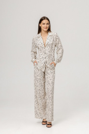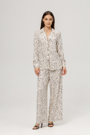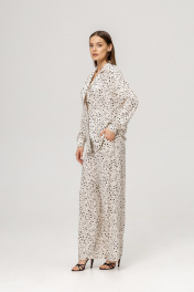 Модный костюм в пижамном стиле с жакетом и брюками - это идеальный выбор для тех, кто хочет выгядеть стильно и комфортно одновременно. Брючный костюм выполнен из мягкого и очень приятного тактильно материала- 100% вискозы. Костюм свободного кроя, жакет с манжетами и боковыми разрезами. Брюки с удобной резинкой в талии и карманами.