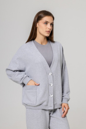 Классический кардиган прямого силуэта с карманами, симметричный, среднего обьема. Застежка на пуговицах. Вырез горловины V-образной формы.Линия плеча спущена.Рукава втачные, длинны, внизу на манжете, что позволяет при желании, подтягивать рукав и фиксировать возле локтя.. Карманы встроены в боковой шов, с декоративным оформлением из кашкорсе верхней части кармана. Длина кардигана у размеров S и М 65 см, у размера L и XL- 72см.