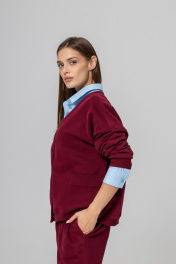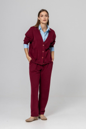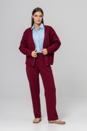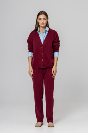 Костюм (кардиган +_брюки )из премиального хлопкового футера с велюровым напылением.Классический кардиган прямого силуэта с карманами, симметричный, среднего обьема. Застежка на пуговицах. Вырез горловины V-образной формы.Линия плеча спущена.Рукава втачные, длинны, внизу на манжете, что позволяет при желании, подтягивать рукав и фиксировать возле локтя.. Карманы встроены в боковой шов, с декоративным оформлением из кашкорсе верхней части кармана. Длина кардигана у размеров S и М 65 см, у размера L и XL- 72см. Брюки из хлопкового футера с велюровым напылением, зауженные книзу, с высокой талией.и Притачной пояс со шлевками, сзади на резинке, передние половины со складками, застежка на молнию и пуговицы, боковые карманы. Длина внутреннего шва брюк 78 см