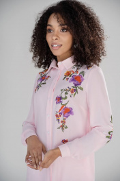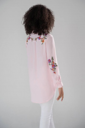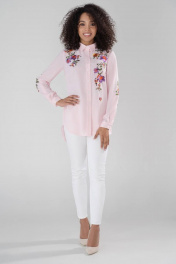 Для жаркого лета, стильная блузка с вышивкой это то что надо! В ней вы будете чувствовать себя непринуждённо и комфортно. Блузка женская из блузочной ткани с художественной вышивкой, прямого кроя, с центральной бортовой застежкой до верха на 7 петель пуговиц, расположенных на притачной планке и одной петлей и пуговицей расположенной на стойке воротника. Перед блузки с нагрудными вытачками, выходящими из бокового шва. Полочки блузки с асимметричной вышивкой. Спинка цельновыкроенная с отрезной кокеткой и бантовой складкой. На кокетке спинки расположена симметричная вышивка. Рукав втачной одношовный рубашечного типа, длинный. Низ рукава с двумя складками и окантованным разрезом и притачной манжетой, застегивающейся на петлю и пуговицу. Рукав с патой, конец которой застегивается на петлю и пуговицу (размер и цвет фурнитуры может незначительно отличаться от фото). Горловина круглой формы, обработана отложным воротником рубашечного типа с отрезной стойкой. Линия низа асимметричная (спинка немного длиннее чем перед). Низ обработан швом вподгибку с закрытым срезом. В боковых швах обработаны разрезы с отделочной строчкой на 0,2 см от края. Длина блузы по середине спинки – 76,0 см (±2,0 см), Длина рукава– 60,0 см. Тип ткани: блузочная. Состав: хлопок - 72%, полиэстер - 25%, спандекс - 3%.