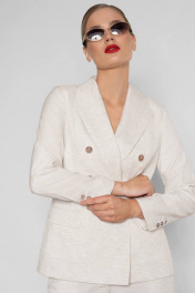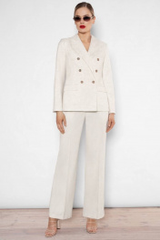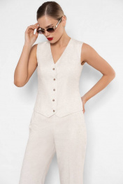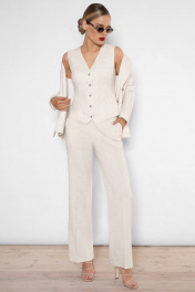 Летний костюм с льняной ткани давно стал важной составляющей летнего гардероба. Он добавляет уверенности, делает нас женственнее и, главное, легко подстраивается под остальные составляющие гардероба. Жилет на пуговицах на голое тело — модный тренд этого лета, который стоит взять на вооружение. Костюм женский трехпредметный из костюмно-плательной ткани, состоит из широких брюк, укороченной жилетки полуприлегающего силуэта и жакета оверсайз. Жилетка женская полуприлегающего силуэта, с центральной бортовой застежкой на 5 петель и пуговиц (размер и цвет фурнитуры может незначительно отличаться от фото), на подкладке. Перед жилетки с рельефными швами идущим от проймы до низа изделия, и прорезными карманами «с листочкой» расположенными ниже уровня линии талии. Низ борта скошенный. Спинка со средним швом и рельефными швами идущим от проймы до низа изделия. Горловина без воротника с V-образным вырезом, обтачная. Проймы без рукавов, обтачные. Низ изделия фигурной формы. Жакет полуприлегающего силуэта из костюмной ткани, двубортный со смещенной бортовой застежкой на 2 петли и пуговицы, расположенные на уровне линии талии, остальные 4 пуговицы несут декоративный характер (размер и цвет фурнитуры может незначительно отличаться от фото). Жакет на притачной подкладке. Перед жакета с боковыми рельефными швами идущими от проймы до низа изделия и нагрудными вытачками выходящими из центра груди до шва кармана. Перед с прорезными карманами «в рамку» и клапанами, расположенными чуть ниже уровня линии талии. Углы клапана - прямые. Спинка с боковыми рельефными швами от линии проймы до линии низа и со средним швом. По низу среднего шва спинки - шлица. Рукава втачные двухшовные, длинные. По низу локтевого шва обработана шлица, которая застегивается на 3 петли и пуговицы. Плечевой пояс оформлен при помощи плечевых накладок. Воротник пиджачного типа с широкими лацканами. Углы воротника прямые, лацканы - острые с закруглением. Брюки женские из костюмной ткани, со стрелками. Перед брюк с боковыми карманами, линия входа в карман наклонная. В боковом шве обработана застежка на потайную тесьму-молнию. Задние половинки брюк с талиевыми вытачками и прорезными карманами в «рамку». Верхний край брюк обработан притачным поясом. Средняя длина жилетки по среднему шву спинки - 51,0 см (±3,0 см), Средняя длина жакета по среднему шву спинки - 64,0 см (±3,0 см), Длина рукава - 60,5 см (±2,0 см), Средняя длина брюк по боковому шву -108,5 см (±4,0 см). Тип ткани на жакет, жилетку и брюки: Состав: полиэстер - 39%, вискоза - 32%, лен - 29%. Состав подкладки: хлопок - 100%