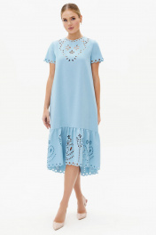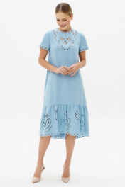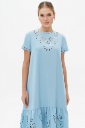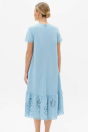 Летнее платье с перфорацией - это настоящий шедевр, созданный для того, чтобы подчеркнуть вашу красоту и элегантность. Оно выполнено из легкого и мягкого материала, который обеспечивает комфорт и свободу движений. Перфорация на платье добавляет ему легкости и воздушности, а также создает эффектный образ, который притягивает взгляды окружающих. Синий цвет придает платью глубину и насыщенность, создавая стильный и изысканный образ. Это платье идеально подходит для летних дней, когда хочется наслаждаться теплом и красотой природы.. Платье свободное трапециевидного силуэта для повседневной носки с ассиметричным низом, с притачным воланом по низу. Перед без нагрудных вытачек. Спинка со средним швом, в верхней части среднего шва обработана застежка на потайную тесьму-молнию. В боковых швах на уровне линии бедра, обработаны карманы в швах. Рукава втачные одношовные, короткие. Горловина круглой формы. В верхней части переда - отлетная подкладка. По низу волана и рукава, горловине и лифу переда расположена декоративная перфорация. Длина платья по среднему шву спинки до низа - 117,0 см (±3,0 см), Длина рукава платья - 18,0 см (±1,0 см). Тип ткани: плательная. Состав: полиэстер - 100%.