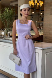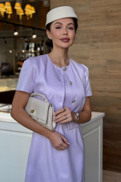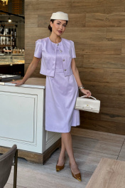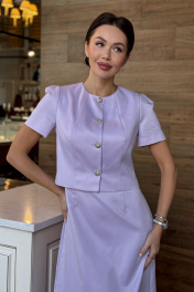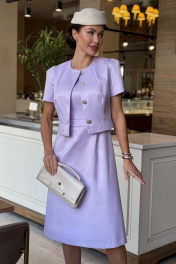 Лавандовый костюм с платьем от URS - это элегантное решение для тех, кто ищет женственный, современный и универсальный образ. Такой костюм двойка с платьем легко вписывается и в праздничный гардероб, и в деловой стиль, а мягкий оттенок делает комплект особенно благородным. Это тот самый нарядный костюм женский, который помогает выглядеть собранно, дорого и уместно в самых разных ситуациях. Комплект женский 2-х предметный ЮРС, состоящий из укороченного жакета и платья, выполненного из костюмно-плательной ткани. Комплект предназначен как для нарядной, так и для повседневной носки. Жакет укороченный, прилегающего силуэта, перед и спинка на подкладке, с центральной бортовой застежкой до верха на 4 петли и 4 пуговицы (размер и цвет фурнитуры может незначительно отличаться от фото). Перед с рельефными швами, проходящими через центр груди, идущими от горловины до низа. Спинка со средним швом, с рельефными швами, идущими от пройм до низа. Горловина переда и спинки округлой формы, обтачная. Рукава втачные, одношовные, короткие, со встречной складкой от плеча, без подкладки. Платье женское полуприлегающего силуэта, слегка расширенное к низу, отрезное по линии талии с притачным поясом, без рукавов, на отлетной по низу подкладке. Верхняя часть переда с рельефными швами, проходящими через центр груди и идущими из пройм, вниз до пояса. Верхняя часть спинки с рельефными швами, идущими из пройм, вниз до пояса. Нижняя часть переда и спинки с талиевыми вытачками, от пояса вниз. Спинка в верхних и нижних частях со средним швом, в котором от горловины вниз обработана застежка на потайную тесьму - ""молнию"". Горловина спинки и переда ""каре"". Проймы и горловина обтачные. " 42 размер Жакет Длина по среднему шву спинки - 43,0 см (±1,5 см), Ширина спинки - 35,5см (±0,5 см), Ширина на уровне глубины проймы - 48,0 см (±1,0 см), Ширина по низу изделия - 40,0 см (±1,0 см), Длина рукава - 23,0 см (±1,0 см), Ширина рукава - 16,5 см (±1,0 см), Длина плеча - 10,3 см (±0,5см). Платье Длина по среднему шву спинки - 102,5 см (±2,0 см), Ширина на уровне глубины проймы - 43,5 см (±1,0 см), Ширина на уровне линии талии - 36,5 см(±1,0 см), Ширина на уровне линии бедер - 48,0 см (±1,0 см), Длина плеча - 7,5 см (±0,5 см), Ширина по низу платья - 60,0 см (±1,0 см). 44 размер Жакет Длина по среднему шву спинки - 43,0 см (±1,5 см), Ширина спинки - 37,0см (±0,5 см), Ширина на уровне глубины проймы - 50,5 см (±1,0 см), Ширина по низу изделия - 42,0 см (±1,0 см), Длина рукава - 23,0 см (±1,0 см), Ширина рукава - 17,5 см (±1,0 см), Длина плеча - 10,3 см (±0,5см). Платье Длина по среднему шву спинки - 102,5 см (±2,0 см), Ширина на уровне глубины проймы - 45,5 см (±1,0 см), Ширина на уровне линии талии - 38,5 см(±1,0 см), Ширина на уровне линии бедер - 50,5 см (±1,0 см), Длина плеча - 7,5 см (±0,5 см), Ширина по низу платья - 62,0 см (±1,0 см). 46 размер Жакет Длина по среднему шву спинки - 43,0 см (±1,5 см), Ширина спинки - 37,0см (±0,5 см), Ширина на уровне глубины проймы - 52,5 см (±1,0 см), Ширина по низу изделия - 44,5 см (±1,0 см), Длина рукава - 23,0 см (±1,0 см), Ширина рукава - 18,5 см (±1,0 см), Длина плеча - 10,3 см (±0,5см). Платье Длина по среднему шву спинки - 102,5 см (±2,0 см), Ширина на уровне глубины проймы - 47,5 см (±1,0 см), Ширина на уровне линии талии - 40,5 см(±1,0 см), Ширина на уровне линии бедер - 52,5 см (±1,0 см), Длина плеча - 7,5 см (±0,5 см), Ширина по низу платья - 63,0 см (±1,0 см). 48 размер Жакет Длина по среднему шву спинки - 43,0 см (±1,5 см), Ширина спинки - 38,5см (±0,5 см), Ширина на уровне глубины проймы - 54,5 см (±