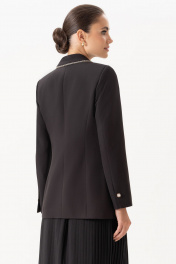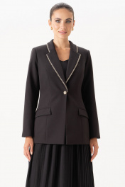 Этот жакет – воплощение элегантности и сдержанной роскоши. Его строгий крой подчеркивает утонченность образа, а изысканная отделка лацканов добавляет блеск и акцентирует внимание на декольте. Деликатные пуговицы с декоративными элементами завершают образ, придавая завершенность и утонченность. Идеальный выбор для деловых встреч или вечерних мероприятий, этот жакет подчеркнет вашу уверенность и безупречный вкус. Жакет женский выполнен из костюмно-плательной ткани, на подкладке, может быть как для нарядной, так и для повседневной носки. Жакет полуприлегающего силуэта, с центральной бортовой застежкой на 1 петлю и 1 декоративную пуговицу (размер и цвет фурнитуры может незначительно отличаться от фото). Перед жакета с рельефными швами, проходящими через центр груди и идущими от пройм вниз. В нижней части переда обработаны наклонные прорезные карманы с клапанами и двумя обтачками. Спинка со средним швом, с рельефными швами, идущими от пройм вниз. Рукава втачные, двухшовные, длинные, по низу локтевого шва с отлетной шлицей, застегивающейся на 1 петлю и 1 декоративную пуговицу. Горловина оформлена воротником пиджачного типа ""в раскеп"", с уступами лацкана. В воротнике уступы отсутствуют. Отлет воротника и отлет лацканов до петли и пуговицы оформлены декоративной тесьмой (размер и цвет тесьмы может незначительно отличаться от фото). Жакет с плечевыми накладками. Средняя длина жакета по середине спинки 69,5 см, (±2,0 см); Средняя длина рукава жакета - 61,0 см (±2,0 см); Состав жакета: полиэстер - 78%, вискоза 16%, спандекс - 6%.