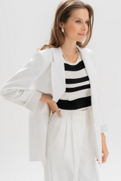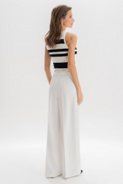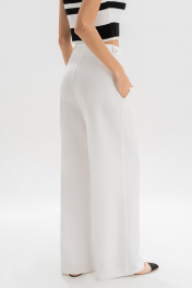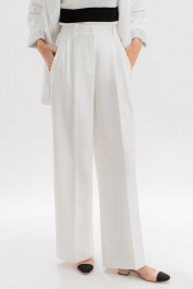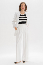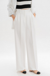 Эта модель рассчитана на девушек с ростом 176–182 см, позволяя создать элегантный, вытянутый силуэт. Идеальные белые брюки — основа капсульного гардероба. Модель выполнена в прямом крое, визуально вытягивающем силуэт и придающем образу легкость. Аккуратные стрелки, лаконичные складки от пояса и деликатные вытачки формируют безупречную посадку. Пояс с регулируемыми патами обеспечивает комфортную посадку на талии, а универсальный цвет легко сочетается как с базовыми топами, так и с яркими акцентами. Брюки женские, прямые, выполнены из костюмно-плательной ткани. Передние и частично задние половинки брюк, с отрезным поясом, задние половинки брюк от вытачки до бокового шва с цельнокроеным поясом, с застёжкой на тесьму - «молнию», расположенную в среднем шве передних половинок. Пояс застегивается спереди на один пришивной крючок и 1 петлю и 1 потайную пуговицу. Для регулировки пояса по талии в боковых швах обработаны паты, застегивающиеся на 1 петлю и 2 пуговицы. Передние половинки брюк с боковыми наклонными карманами, частично застроченными от пояса вниз на 3,0 см, с двумя парами односторонних складок от пояса, и 2-мя шлевками. Задние половинки брюк с талиевыми вытачками. Передние и задние половинки брюк с заутюженными стрелками. Состав ткани: полиэстер - 80%, вискоза - 11%, спандекс - 9%. Тип ткани Костюмно-плательная