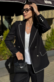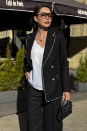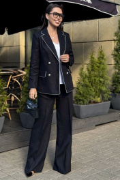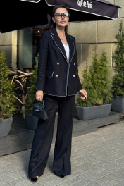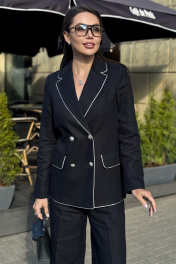 Женский льняной костюм с брюками и жакетом — элегантный выбор для офиса и повседневной жизни Откройте для себя стиль и комфорт с женским льняным костюмом чёрного цвета, состоящим из прямых брюк и двубортного жакета с декоративной отделкой. Эта модель создана для тех, кто ценит лаконичность, натуральные ткани и безупречную посадку. Костюм женский 2-х предметный, состоит из жакета и брюк, выполненных из костюмной льняной ткани, предназначен для повседневной носки. Жакет свободного полуприлегающего силуэта, на подкладке, с двубортной застежкой на 2 петли и 4 металлические пуговицы (размер и цвет фурнитуры может незначительно отличаться от фото). Перед и спинка с отрезным бочком. Перед в нижних частях с прорезными карманами с клапаном и обтачкой, с талиевыми вытачками, с рельефными швами бочка. Клапаны по двум сторонам с отделочным серебристым кантом, концы клапанов слегка закруглены. Спинка со средним швом, с рельефными швами бочка. Рукава втачные, двухшовные, длинные. В локтевом шве по низу с отлетной шлицей с 3-мя петлями и 3-мя пуговицами. Горловина оформлена воротником пиджачного типа. Концы воротника и лацкана закругленные. Воротник, лацканы, борта, низ переда и спинки обработан отделочным серебристым кантом. Жакет с плечевыми накладками. Брюки женские прямые от бедра, в размерах 42,44,46,48 на обтачном поясе, в размерах 50,52,54,56 с притачным поясом, с резинками на уровне боковых швов. По поясам с 5-ю шлевками, с застежкой на тесьму - «молнию», расположенную в среднем шве передних половинок. Пояс застегивается спереди на 1 пришивной потайной крючок, 1 петлю и 1 потайную пуговицу (размер и цвет фурнитуры может незначительно отличаться от фото). Передние половинки брюк с боковыми наклонными карманами. Задние половинки брюк с талиевыми вытачками, идущих от пояса вниз. Брюки с заутюженными стрелками по передним и задним половинкам. ; Цвет: Черно-синий. 42 размер ЖАКЕТ: длина по среднему шву спинки - 67,5 см (±1,5 см),Ширина спинки - 36,5 см (±0,5 см), Ширина на уровне глубины проймы - 47,0 см (±1,0 см), Ширина на уровне линии талии - 45,0 см (±1,0 см), Ширина на уровне линии бедер - 51,0 см (±1,0 см), Длина рукава - 61,5 см (±1,0 см), Ширина рукава вверху - 16,5 см (±1,0 см). Ширина рукава по низу - 12,5 см (±0,5 см), Длина плеча - 12,0 см (±0,5 см). БРЮКИ: длина брюк по боковому шву с поясом - 111,0 см (±3,0 см), Ширина на уровне линии талии - 34,5 см (±1,0 см), Ширина на уровне линии бедер - 46,5 см (±1,0 см), Ширина брюк по низу - 30,5 см (±1,0 см), Ширина пояса - 5,0 см. 44 размер Жакет Длина по среднему шву спинки - 67,5 см (±1,5 см),Ширина спинки - 36,5 см (±0,5 см), Ширина на уровне глубины проймы - 49,0 см (±1,0 см), Ширина на уровне линии талии - 47,0 см (±1,0 см), Ширина на уровне линии бедер - 53,0 см (±1,0 см), Длина рукава - 61,5 см (±1,0 см), Ширина рукава вверху - 17,5 см (±1,0 см). Ширина рукава по низу - 12,5 см (±0,5 см), Длина плеча - 12,0 см (±0,5 см). БРЮКИ: длина брюк по боковому шву с поясом - 111,0 см (±3,0 см), Ширина на уровне линии талии - 36,5 см (±1,0 см), Ширина на уровне линии бедер - 48,5 см (±1,0 см), Ширина брюк по низу - 31,0 см (±1,0 см), Ширина пояса - 5,0 см. 46 размер ЖАКЕТ: длина по среднему шву спинки - 67,5 см (±1,5 см),Ширина спинки - 38,5 см (±0,5 см), Ширина на уровне глубины проймы - 51,0 см (±1,0 см), Ширина на уровне линии талии - 49,0 см (±1,0 см), Ширина на уровне линии бедер - 56,0 см (±1,0 см), Длина рукава - 61,5 см (±1,0 см), Ширина рукава вверху - 18,0 см (±1,0 см). Ширина рукава по низу - 13,0 см (±0,5 см), Длина плеча - 12,0